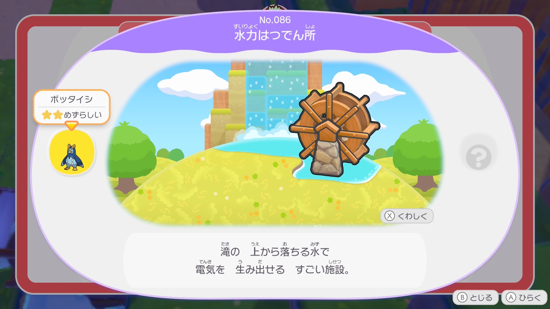 生息地:No.86 水力はつでん所 必要なもの 水力はつでんマシン・・・1 たき・・・1 みず・・・2 出現ポケモン この生息地で出現するポケモン ポッタイシ(ドンヨリうみべの街) -