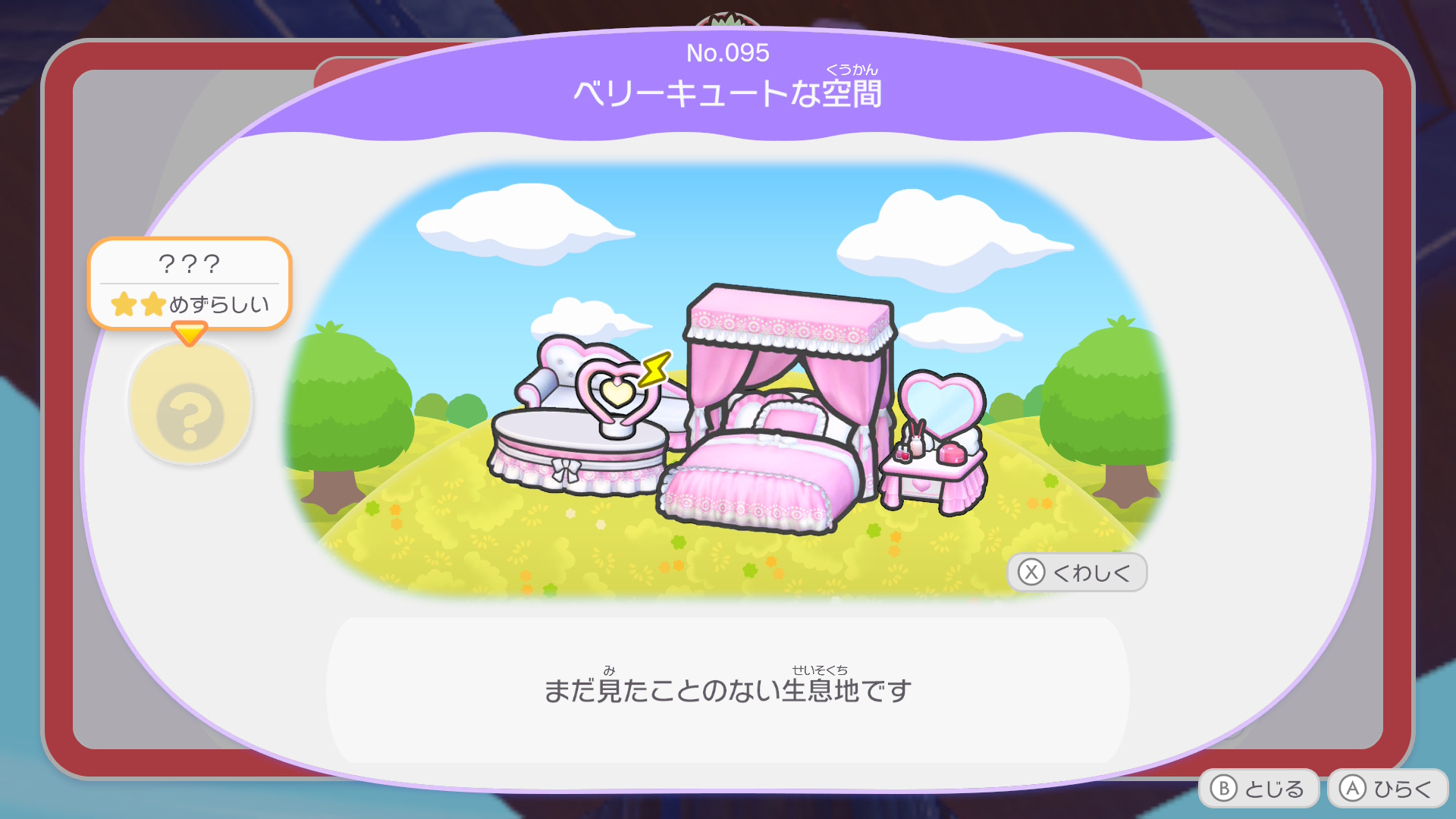 生息地:No.95 ベリーキュートな空間 必要なもの キュートなソファ・・・1 キュートランプ・・・1 キュートなドレッサー・・・1 キュートなテーブル・・・1 キュートなベッド・・・1 出現ポケモン この生息地で出現するポケモン 未確認 -
